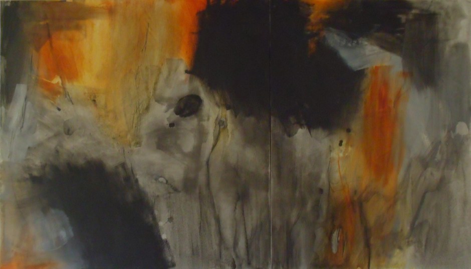« Les Aiguilles cuivrées des mélèzes – tombent en faufilant – la robe grise de l’automne » 40×70″ “Brassy larch needles – fall and weave – the grey gown of autumn” diptyque – vendu